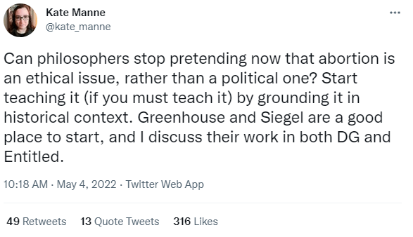The imminent reversal of Roe V Wade has caused considerable debate in feminist spaces about the best way to advocate for abortion rights going forward. To the surprise of many pro-choice philosophers, some feminists (including some prominent feminist philosophers) have responded by arguing that feminists should not engage further with discussions around the ethics of abortion – ie, to avoid spending time debating about controversies over personhood of the fetus, autonomy rights vs right to life, etc. Rather, they argue that abortion should be seen purely through a political lens, with discussions of abortion ethics actually discouraged.