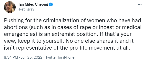 Further, if this is the reason for opposition to prosecution of abortions, pro-life people should be honest about that instead of pretending they have a moral objection to the practice.